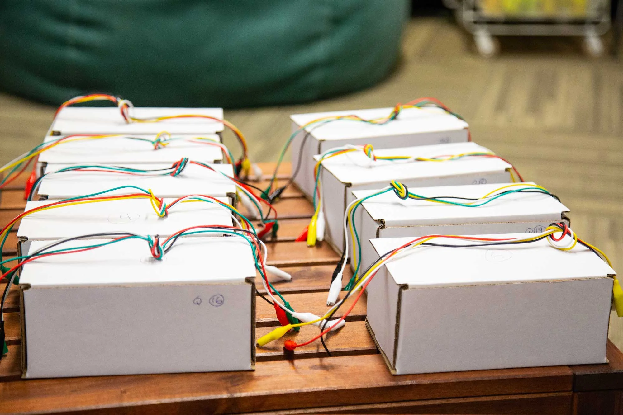 Kits were prepared with: Arduino UNO, Felt for the soft sensor, conductive fabric, fusible interfacing, jumpers, vibration motors, LEDs