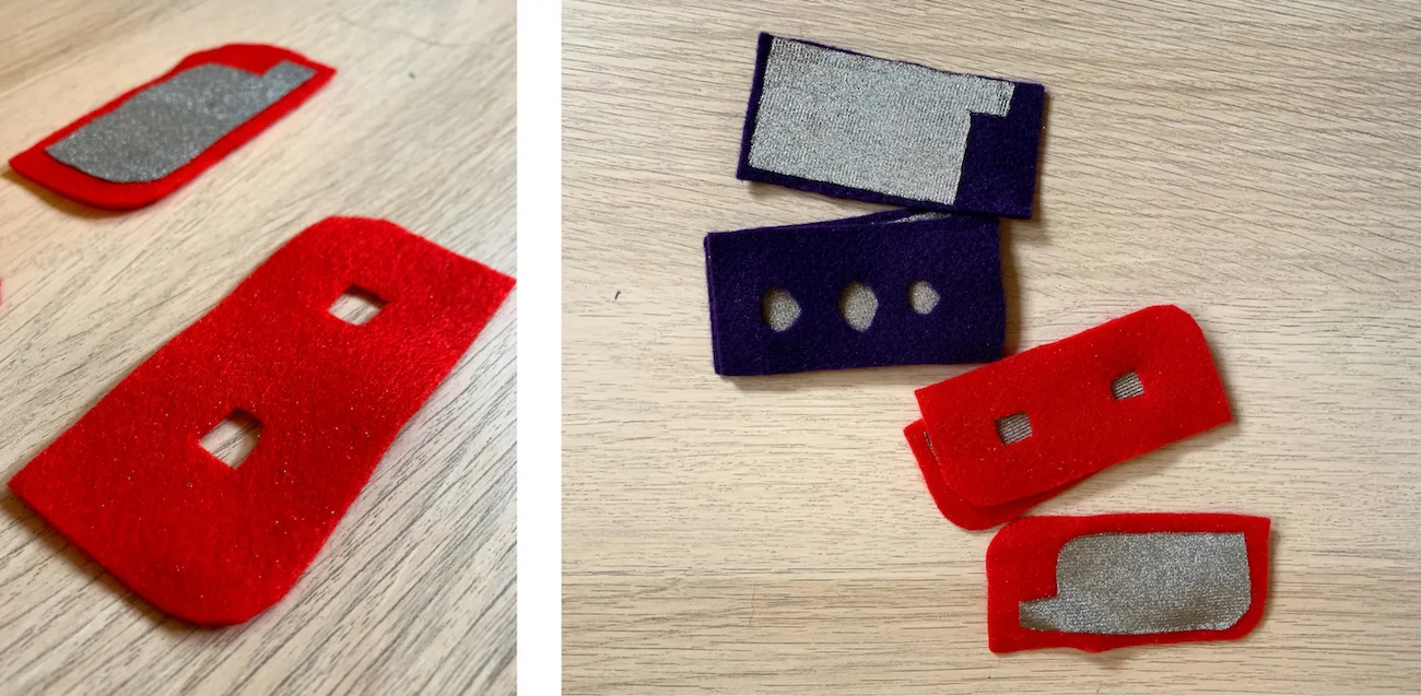 The students first designed the shape and size of their soft sensor (a push button), then cut it and applied the fusible interfacing to then fuse the conductive fabric on top of it.